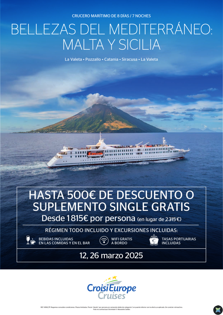 Hasta 500€ DTO. o suplemento single GRATIS - crucero Malta y Sicilia - 8 días - todo incluido - 12/03 + 26/03